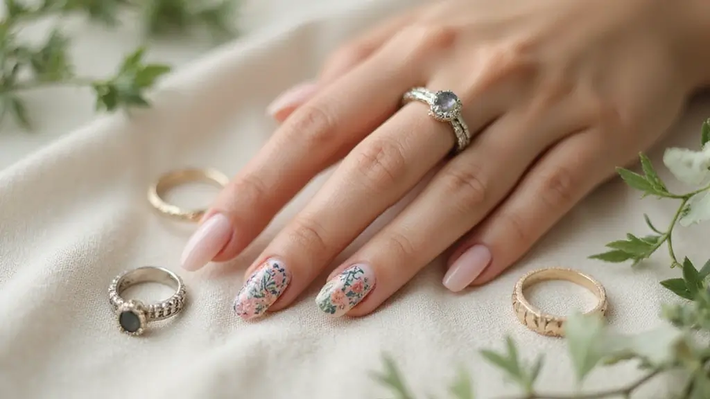 Inspiration: Seek rings with floral designs or gemstones that complement the colors in your nail art.